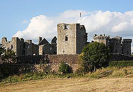 The impressive Raglan Castle, near Raglan in Monmouthshire, begun in the 1430s, was created into a grand fortified castle with a large hexagonal keep, surrounded by parkland, water gardens and terraces. Its decline followed its capture by Parliamentary forces in 1646. It is a fascinating place to visit.