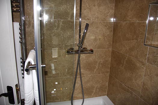 Fluffy white towels, dressing gowns and slippers are provided. Toiletries are by Noble Isle.